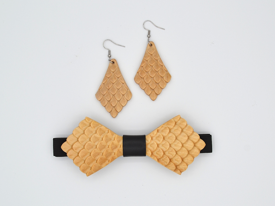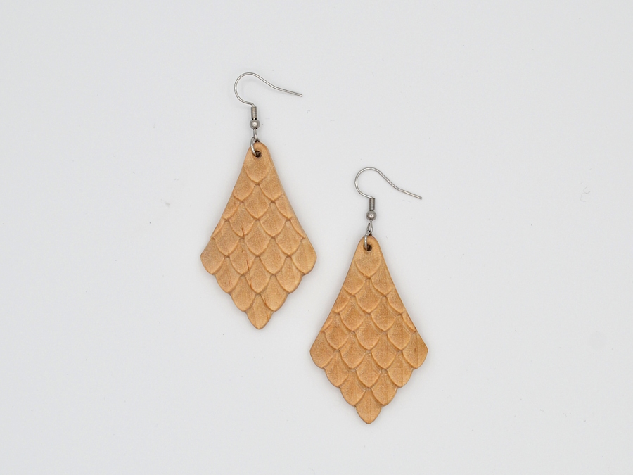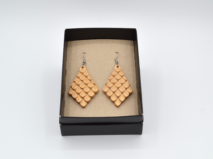 Koivusta valmistetut, elegantit korvakorut, joissa kirurginteräksiset koukut. Korun puuosan pituus on 5 cm.