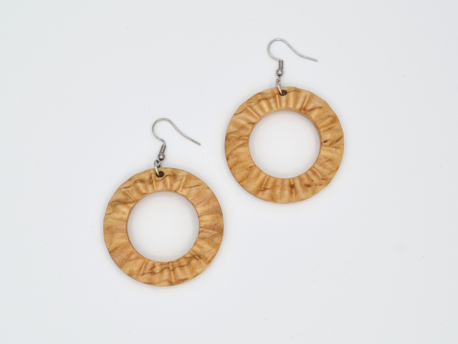 Visakoivusta valmistetut korvakorut, joissa kirurginteräksiset koukut. Korun halkaisija 4,5 cm. Jokainen koru on oma